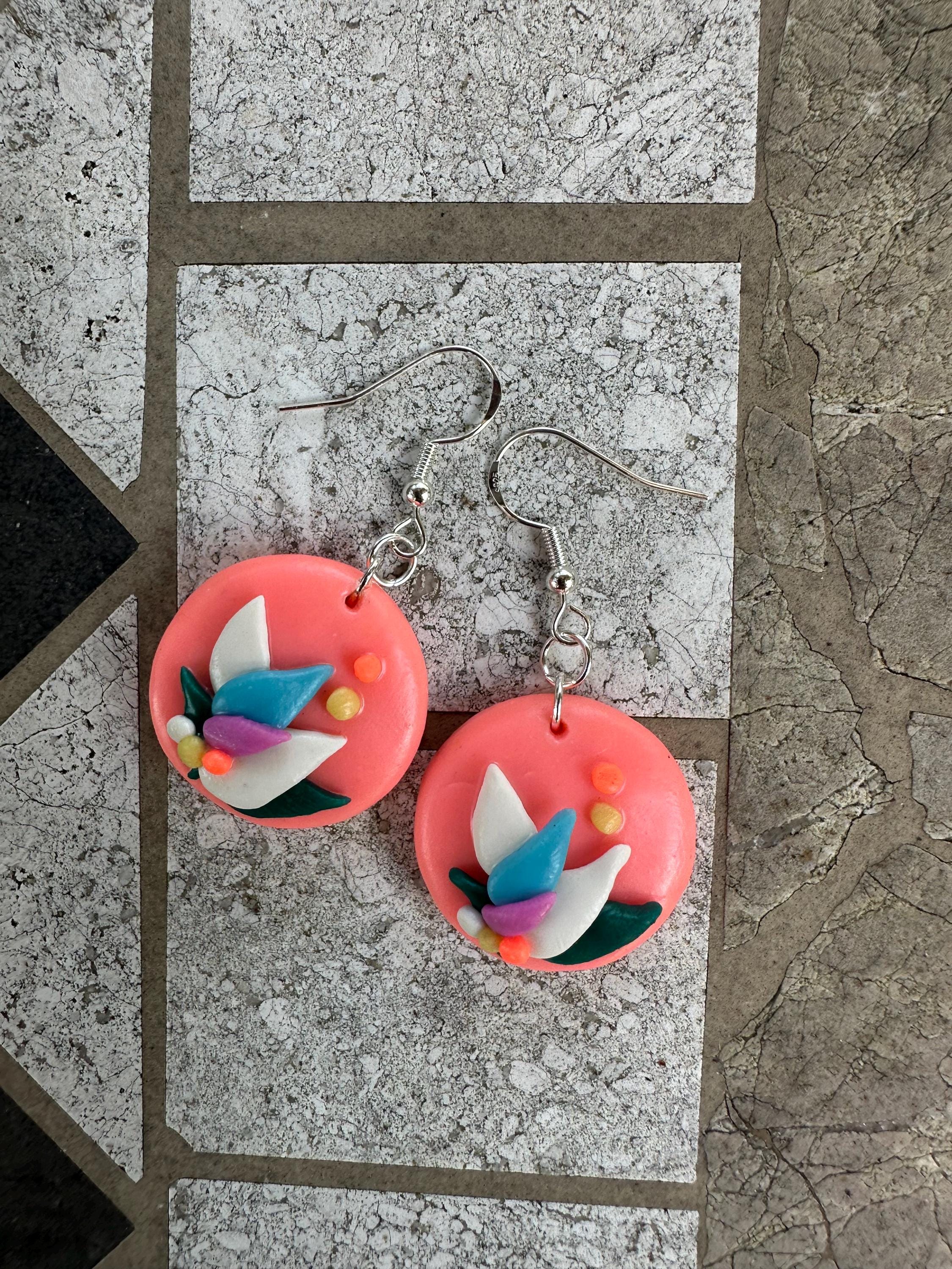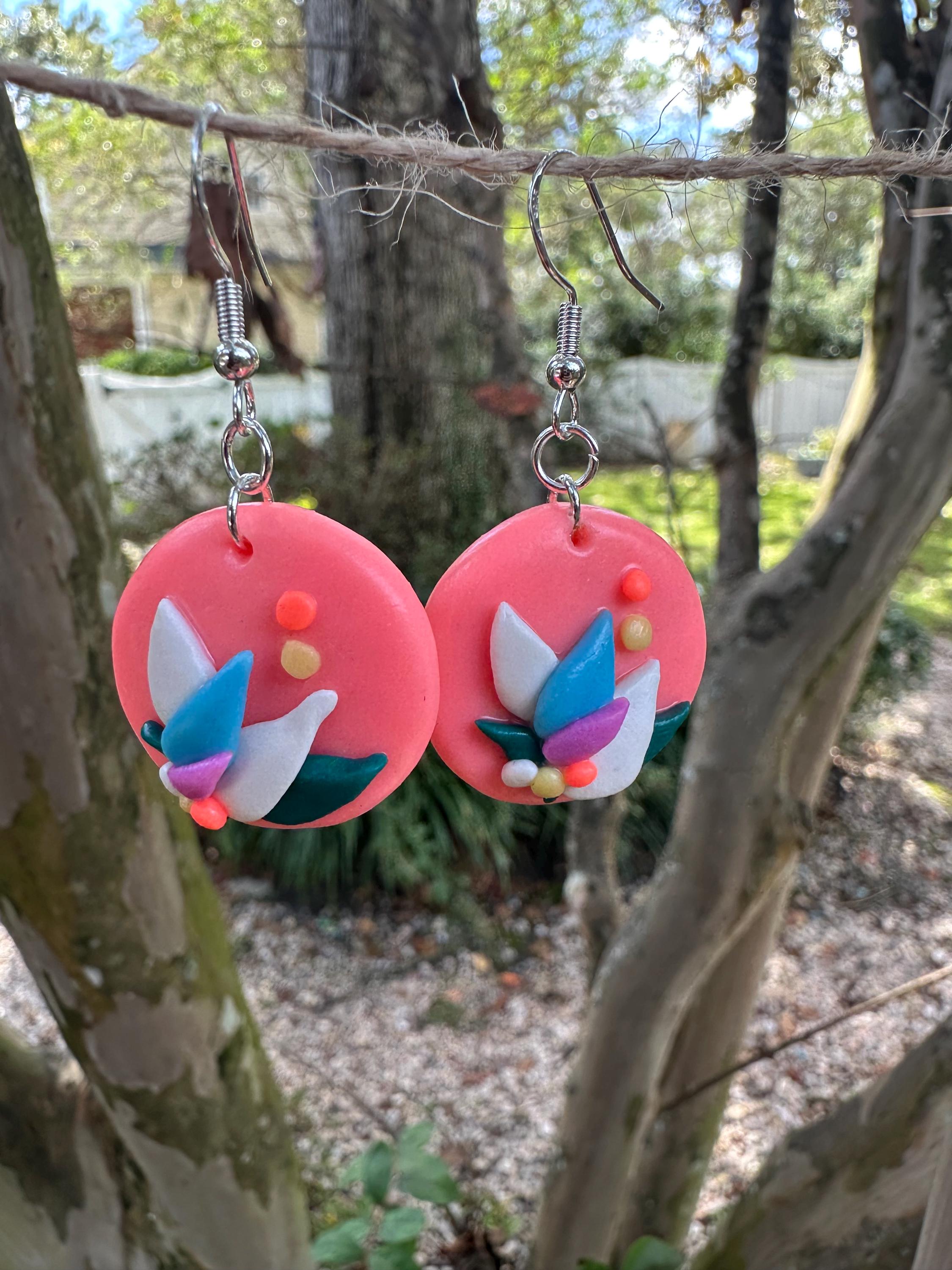Add a burst of color and charm to your look with these handcrafted floral earrings! Each pair features a cheerful coral-pink base adorned with delicate hand-sculpted petals in white, teal, and purple, finished with tiny coral accents. Lightweight and comfortable, they’re perfect for everyday wear or to brighten up a special outfit. These earrings embody a playful, bohemian spirit — unique, vibrant, and made with love by People Worshipping Strawberries. 🌸